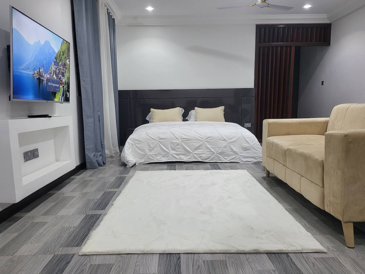 Kotoka Uluslararası Havalimanı'na arabayla 5-10 dakika uzaklıktaki güvenli, emniyetli ve şık bir deneyimin tadını çıkarın. Başkentteki ikonik Signatures Apartmanı'nda, Accra Alışveriş Merkezi'ne yaklaşık 5 dakika yürüme mesafesinde bulunuyoruz. Tam donanımlı spor salonumuzun, çatı katı ve zemin kattaki yüzme havuzlarımızın, oyun merkezimizin ve kütüphanemizin keyfini çıkarın. Size ücretsiz paketleme, güvenlik kameraları ve daha fazlası dahil olmak üzere 24 saat güvenlik sunuyoruz. Gana 🇬🇭 Turizm İdaresi tarafından lisanslıyız.