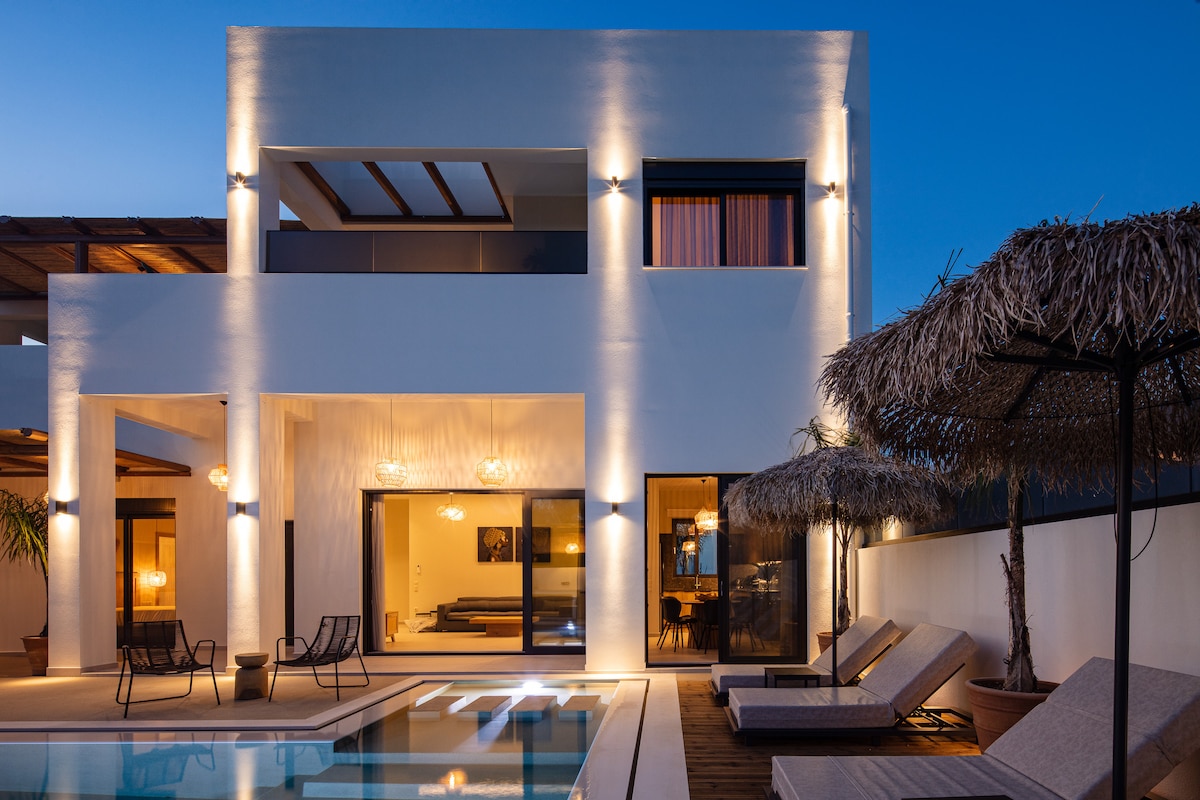 Set in the tranquil village of Kournas, Alva Residence is a 300m² eco-friendly villa offering privacy and luxury for families and groups. With the views of the lake, the sea, and mountains, the villa accommodates 8 guests in 4 bedrooms, with space for 2 more on extra beds. Sleek design with smart features and solar panels, Alva Residence is just 14 minutes from sandy beaches and 20 minutes from Rethymno, includes heated pool, BBQ and playroom.