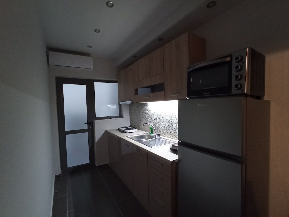 Özel balkonlu, tam donanımlı tek yatak odalı bir stüdyoda konaklama deneyiminin tadını çıkarın. Daire, Agrinio'nun merkezinde (merkez meydana 1 dakika yürüme mesafesinde) mağazalara, restoranlara ve eğlenceye çok yakındır. Fırın ve süpermarket 1 dakika yürüme mesafesinde. Ayrıca Agrinio Belediye otoparkı 2 dakika mesafededir. Şehri keşfetmek isteyen ziyaretçiler için ideal bir konum.