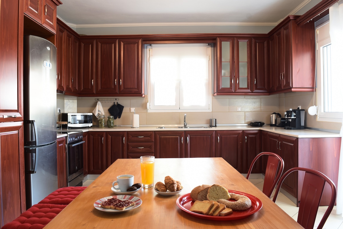 Güzel evimiz Kastraki köyünde, köyün ana meydanına 290 metre mesafededir. Ev en fazla 6 kişi ağırlayabilir. Bir aile veya küçük bir arkadaş grubunu barındırabilir. İki yatak odası, iki banyo, tam donanımlı bir mutfak ve bir oturma odası (yataklara dönüştürülebilen iki kanepeden oluşur) bulunmaktadır. Evin önünde, misafirlerin arabalarını ücretsiz olarak park edebilecekleri açık bir ortak alan vardır (özel mülk). Misafirlerin çamaşır makinesine erişimi vardır.