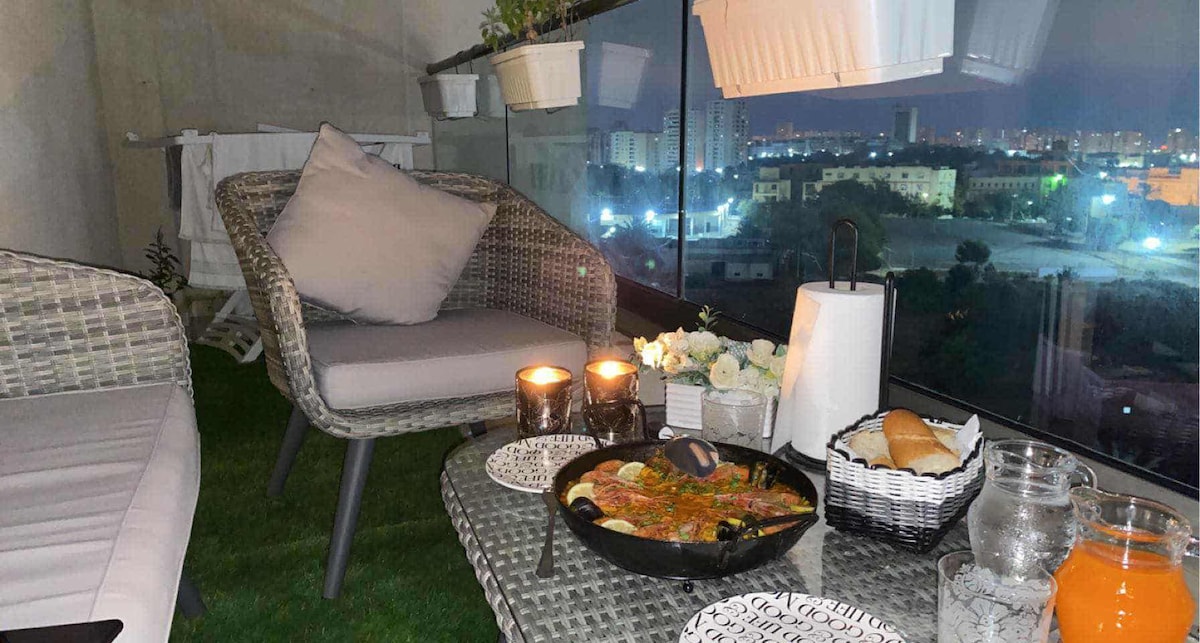• Çift kişilik yataklı 1 yatak odası - çift kişilik yatak 200 cm * 200 cm • Netflix'li 2 LG akıllı TV • 1 adet tek kişilik yatak. • Oturma odası - L şeklinde koltuk • Yemek odası • Tam donanımlı mutfak. • Deniz manzaralı balkon • Rezidansta fitness merkezi • Beşik (istek üzerine) Rezidans, Oran'ın göbeğinde, deniz kenarının önünde, Santa Cruz Kalesi'ne 9 km ve Ahmed Ben Bella Havaalanı'na 15 km uzaklıktadır.