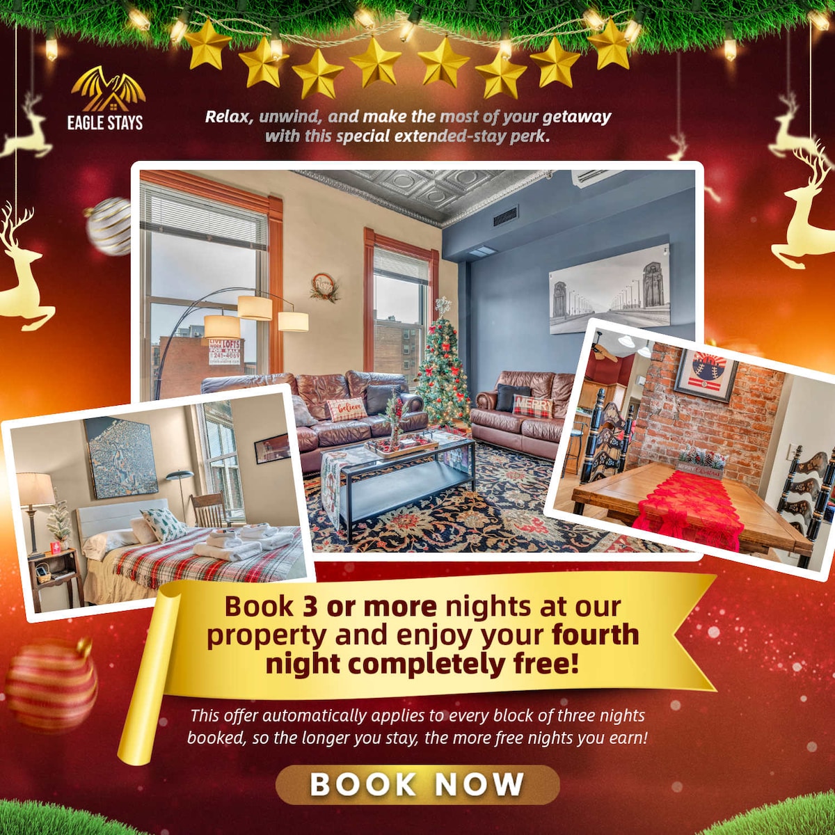 Book three or more nights at our property and enjoy your fourth night completely free through the end of March. This offer automatically applies to every block of three nights booked, so the longer you stay, the more free nights you earn! Relax, unwind, and make the most of your getaway with this special extended-stay perk! Discover downtown Cleveland from this stylish and cozy 1-bedroom condo in the heart of the city. Just steps from Browns Stadium, top dining, and Lake Erie’s waterfront, it
