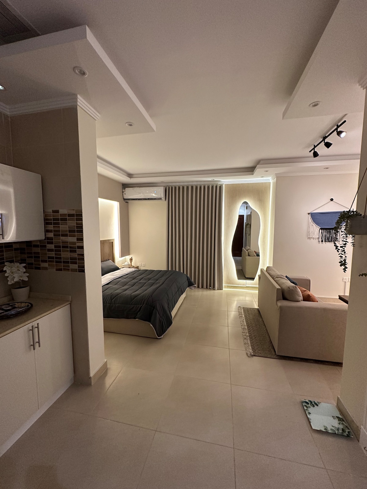 Güzel bir konut. Sundus (Vaha) bölgesinde. Özel ve sessiz. 35 m. Modern mobilyalar. Ses sistemi. 65 inç akıllı ekran. Akıllı giriş. İç izolasyon. Entegre kahve makinesi. Yüksek temizlik seviyesi. Philips hava temizleyici. Aromatik cihaz. Yatak odası pencereleri için otomatik panjur. Tahliye Caddesi üzerinde ve hizmetlere yakın yeni bir konut planı (Sondos). Yasemin Alışveriş Merkezi'ne 10 dakika, Havalimanı'na 17 dakika, Haramain Treni'ne 10 dakika, Corniche'ye 25 dakika.