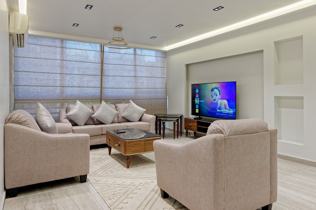 Welcome to your home away from home in the heart of Heliopolis, Cairo! As one of the top 5% hosts in Egypt, we take pride in offering a stylish and comfortable 2-bedroom apartment, designed for a seamless and luxurious short-term stay. This bright and spacious apartment features an open layout, tastefully furnished for your comfort. The living room 🛋️ offers cozy seating and a large flat-screen TV 📺, opening onto a private terrace 🌿 with a beautiful garden oasis—perfect for unwinding.