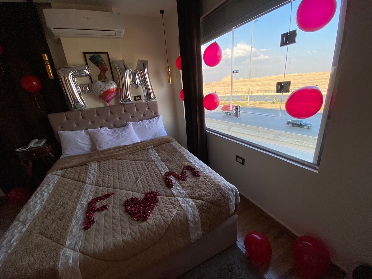 yatak ve balkondan piramit manzaralı deluxe çift kişilik oda. Özel banyo, küvet, saç kurutma makinesi, sıcak su, ayna, şampuan, duş bonesi, tuvalet kağıdı ,havlular. piramit manzaralı çatı katı, çatıda kahvaltı 24 saat resepsiyon , asansör klima ,tv, mini bar, tele , kasa, su ısıtıcısı, ses geçirmez pencere, konforlu yataklar ,modern mobilyalar giza Piramitleri'ne on dakika yürüme mesafesinde, restoranlara ve mağazalara ,ATM Makinelerine yakın, Giza ve Kahire'nin herhangi bir yerine kolay erişim.