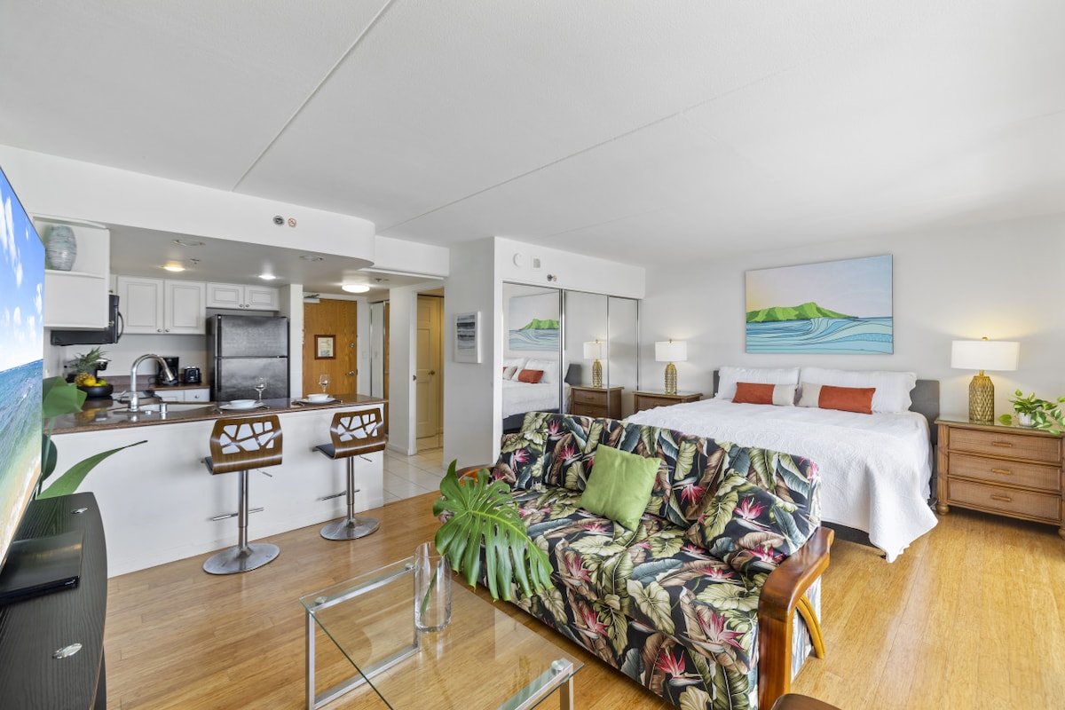 Süpürme okyanus ve sahil manzarası! Waikiki'nin girişinde kullanışlı bir stüdyo. Dünyaca ünlü Waikiki plajlarına ve lagünlerine kısa yürüyüşler; her cuma gecesi havai fişeklerin parladığı Hilton Hawaii Köyü; dünyanın en büyük açık hava alışveriş merkezi: ücretsiz günlük canlı Hawaii müziği ve gösterileri ile Ala Moana alışveriş merkezi; Hawaii Kongre Merkezi; ve birçok restoran ve etkinlik. Kuvars tezgahlı mutfak, güvenli ve hızlı indüksiyonlu ocak. Çift kişilik yatak, masa, ücretsiz park yeri rahat.