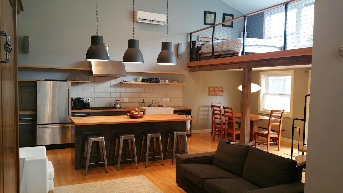 Our recently built, light filled and spacious ADU sits quietly in our back yard and above my painting studio. It's an open, airy and modern loft-style home with reclaimed fir floors, shelving, vanity, and doors. The queen size bed has a super comfy natural latex foam mattress and in the loft there is a fold out sofa with a full size memory foam sleeping pad. It has a well appointed kitchen and washer and dryer for your use. I provide coffee and tea for your stay as well.