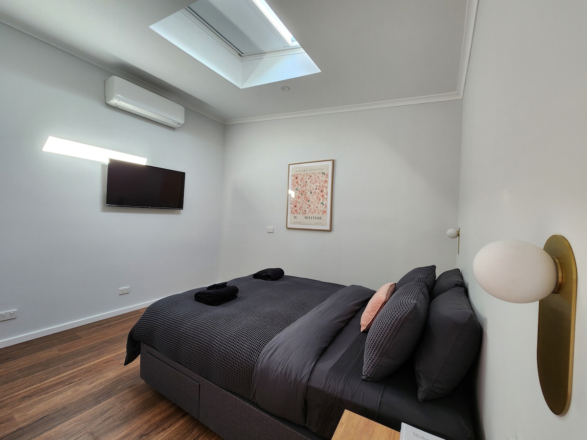 2 yatak odalı dairemiz, dinlenmek ve rahatlamak için sessiz, çağdaş bir alan sunuyor. Gıda ve mağazalara, Botanik Bahçeleri'ne ve Murray Nehri yürüyüş yollarına dakikalar içinde ulaşabileceğiniz kıskanılacak bir konumdadır. Yaşam alanının Albury manzarası vardır ve 70 inç akıllı TV bulunmaktadır. BR 1'de bir kral yatağı ve 2. TV, BR 2'de bir kraliçe yatağı vardır. Her ikisinde de kaliteli nevresim takımlarıyla yapılmış birinci sınıf şilteler vardır. Güvenli otopark, Avrupa mutfağı, kanallı ısıtma/soğutma ve konaklama deneyiminiz tamamlandı.