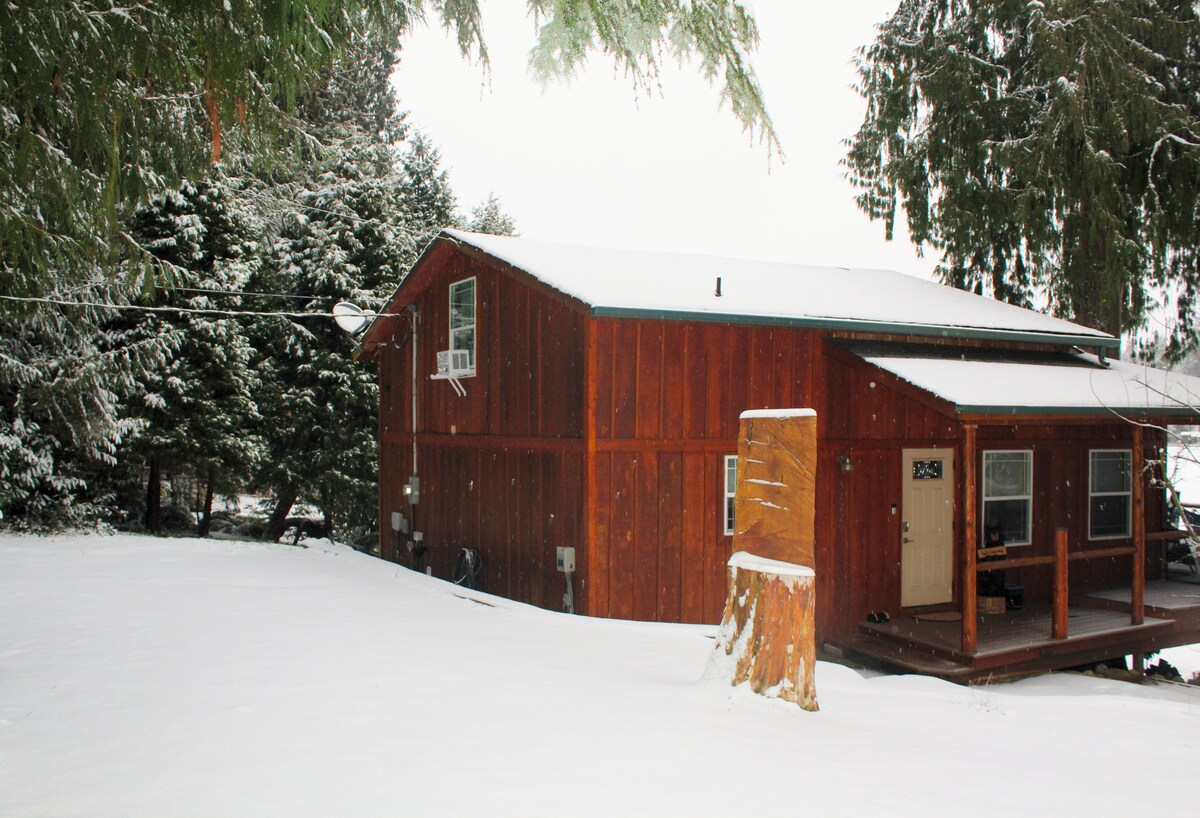 Ashford Lodge'daki Emmons Süiti'ne hoş geldiniz! Mt. Rainier Milli Parkı'nın girişine sadece 6 mil uzaklıktaki küçük Ashford kasabasında yer alır. Rainier Milli Parkı, tüm dağ maceralarınız için mükemmel bir merkezdir. Emmons Cabin, pansiyonumuzdaki en büyük stüdyo süittir ve büyük bir kütük çerçeveli queen boy yatak, şömine, küçük mutfak, özel banyo, kablosuz internet bağlantısı ve özel giriş dahil olmak üzere rahat bir vintage dekora sahiptir. Mekanımızda ortak bir jakuzi, barbekü çardağı, ateş çukuru ve patikalara erişim bulunmaktadır.