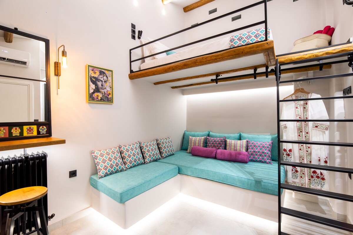 Bu, Volos'un merkezindeki bir apartmanın 1. katında yer alan aydınlık bir stüdyodur. Wi - Fi, klima, buzdolabı, TV ve tüm mutfak gereçlerine sahip mini mutfak gereçleri bulunmaktadır. Mekân hem bireysel misafirler hem de çiftler için uygundur. Volos'un sahil yoluna sadece 3 dakika yürüme mesafesindedir, merkezi pazara (Ermos) 2 dakika uzaklıktadır ve park etmek kolaydır. Mekan, Makrinitsa, Portaria gibi pitoresk Pelion köylerine geziler için idealdir.