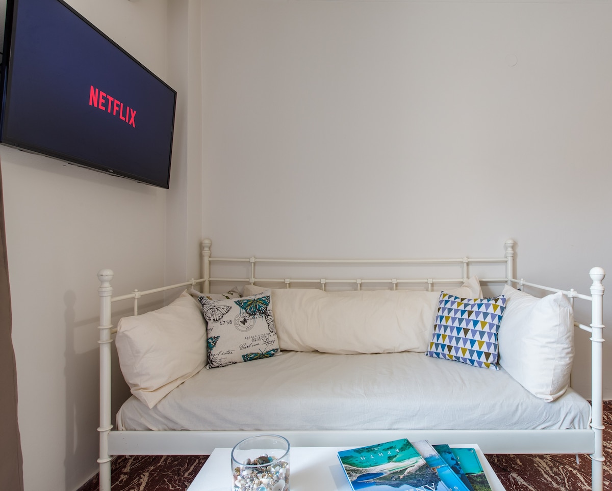 Şehir merkezine ve Nea Chora plajına yürüyerek sadece beş dakika mesafede güneşli bir köşe daire. Ünlü Eski Venedik Hanya Limanı yürüyerek on dakikadan az mesafededir ve şehir merkezindeki Agora pazarı yaklaşık 10 dakikalık yürüyüş mesafesindedir. Mavi bayraklı bir plaj olan Nea Chora'nın sevimli plajı, sadece yüzmek için değil, aynı zamanda deniz ürünleri, Akdeniz ve Girit geleneksel yemeklerinin bulunduğu mükemmel restoranlarıyla ünlü gezinti boyunca akşam gezintileri için de mükemmeldir.
