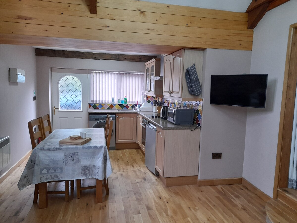 Yeni dönüştürülmüş ahır. Karakterini korumaya çalıştım. Dekorasyon tarımsal/endüstriyel olup, çiftlikteki ham maddelerin çoğu yeniden kullanılmıştır. Hepsi ebeveyn banyolu üç adet king boy yatak bulunmaktadır. Üst katta kanepe ve balkonlu 1 adet çok büyük yatak odası ve 2 adet daha küçük zemin kat yatak odası. Her odada TV ve kablosuz internet bağlantısı vardır. Ana oturma odasında mutfak, masa, büyük L şeklinde kanepe ve sehpa bulunmaktadır: açık havada masa ve sandalyeler, barbekü ve bisikletleri saklamak için kapalı bir alan ve bir elektrikli araç şarj cihazı (50p/kw) vb.
