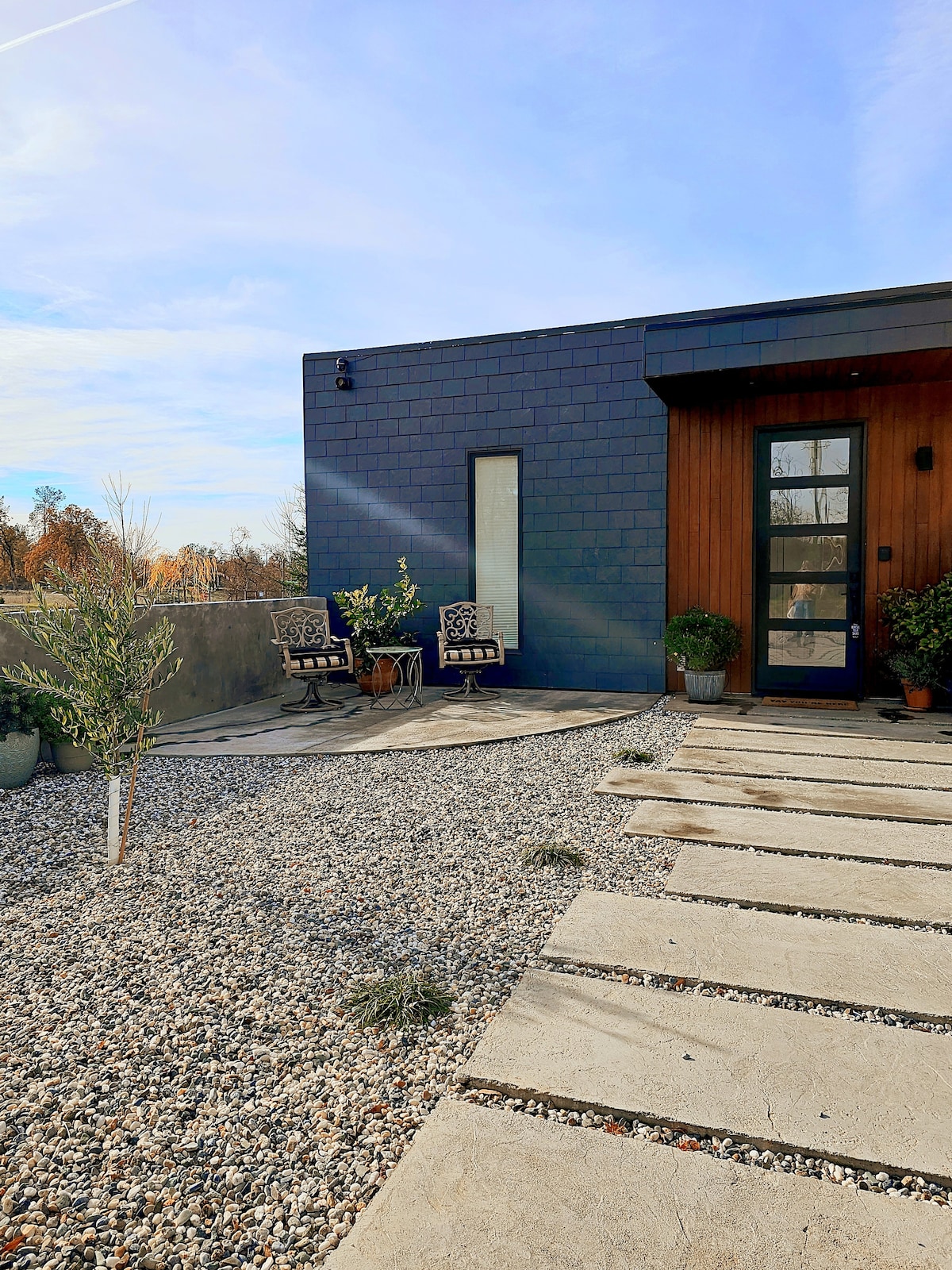 In town but feels like country! Private, safe large parking, and patio area with fire pit. Every comfort considered with large king sized bedrooms. Custom kitchenette with stainless appliances and quartz countertops. Linear gas fireplace, custom concrete hearth, 55" HDTV w/ surround sound, and built in cabinets. Custom oversized tile shower with skylight and tankless hot water. Central Heat & A/C. EV Charger! Easy keypad entrance. Close to I-5 & CA-44. Pet free home. COR Permit SDD-2026-00121