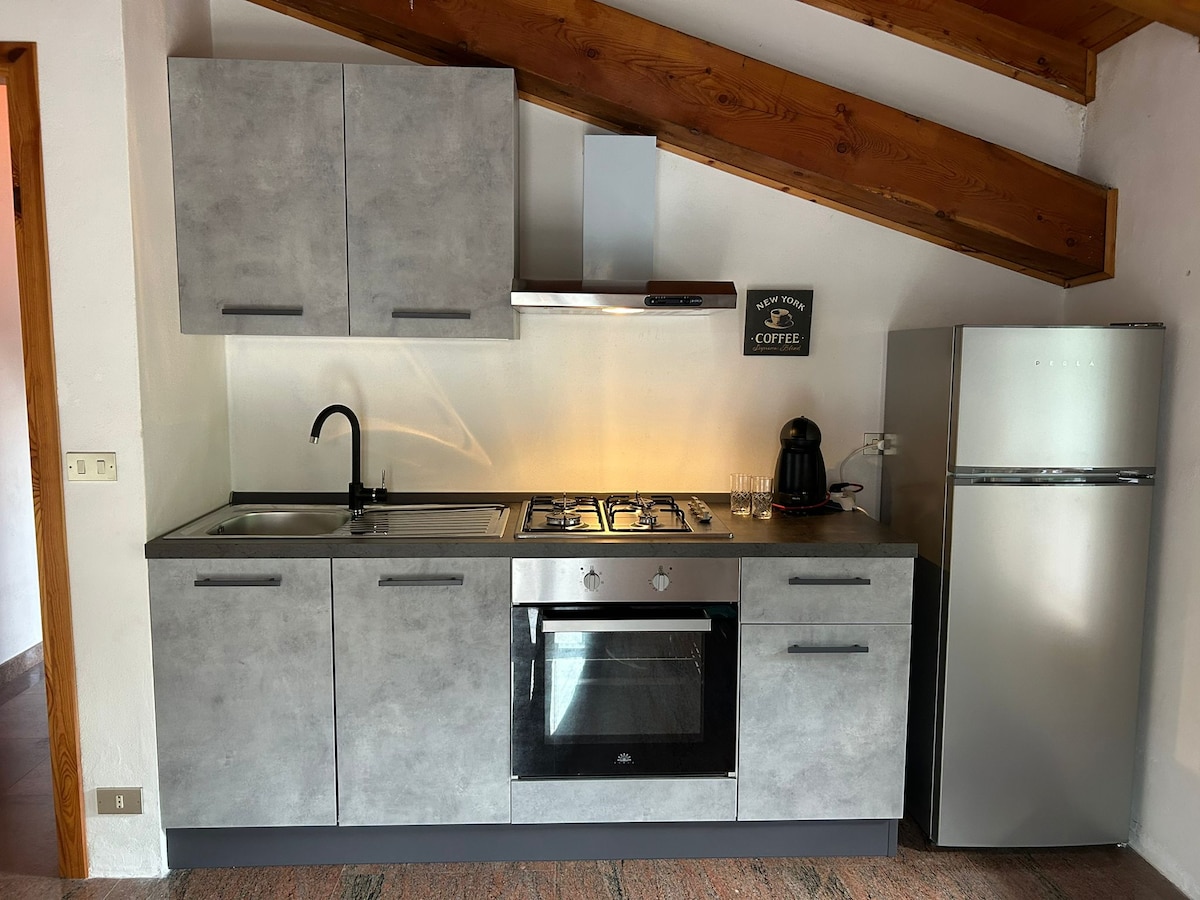Bağımsız bir villanın 2. katında yer alan sıcak bir iki odalı daire. Daire, Idro Gölü'nün muhteşem manzarasının tadını çıkarabileceğiniz dinlendirici bir terasa bakan bir yatak odası bulunan bir çatı katıdır. Oturma odası, gerekli her türlü aletin bulunduğu küçük bir mutfak köşesi ve çekyatlı küçük bir yaşam alanından oluşmaktadır. Oturma odasından, çamaşır kurutma teli bulunan başka bir terasa erişilebilir. Banyoda duş ve bide bulunmaktadır.