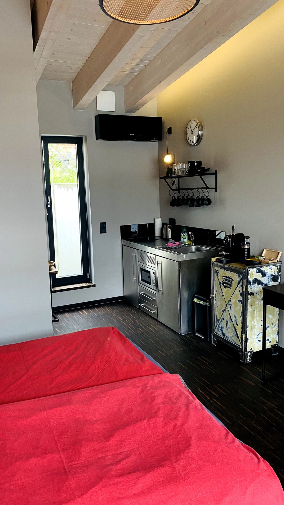 Arkanıza yaslanın ve bu sakin, şık konaklama yerinde dinlenin. Burada müstakil evimizde bir müştemilat dairesi sunuyoruz. Tek kullanım için bir yatak odası, tuvaletli bir duş banyosu, tam otomatik kahve makinesi, ocak, fırın, buzdolabı ve bulaşık makinesi bulunan tam donanımlı bir mutfak ve 33 m²'lik geniş bir oturma/yemek odası bulunmaktadır. Çamaşır odası da bizim tarafımızdan kullanıldığından, ara sıra merdiven boşluğunu ve koridoru da kullanmamız gerekecektir.