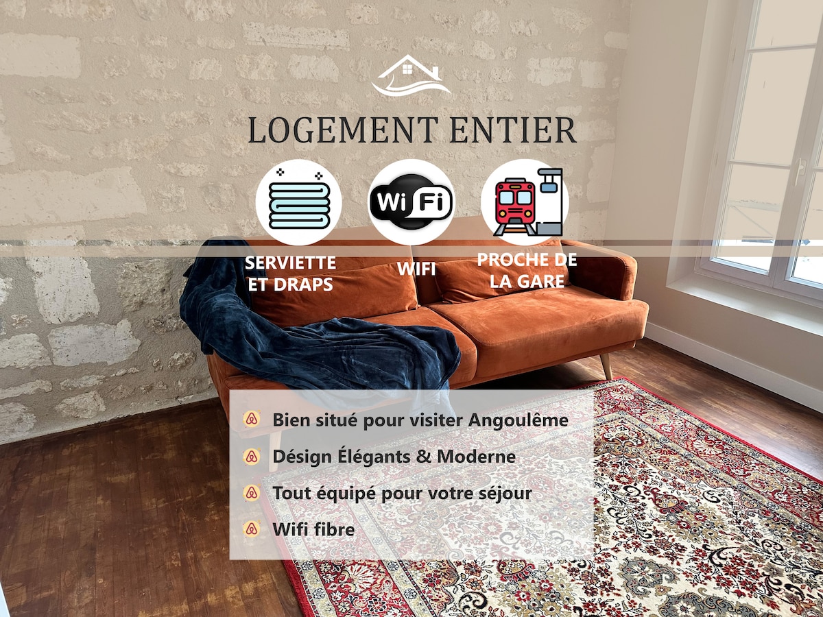 Profitez d'un logement élégant et central composé d'une cuisine, d'un salon, d'une chambre et d'une salle d'eau. Idéal pour profiter à pied des restaurants, commerces, ruelles animées et la Charente (fleuve) à 2 pas Petit déjeuner, draps et serviettes de bain fournis. Nous sommes à 5 min derrière la gare et 10 min du centre ville. Plus qu'à poser ses valises !