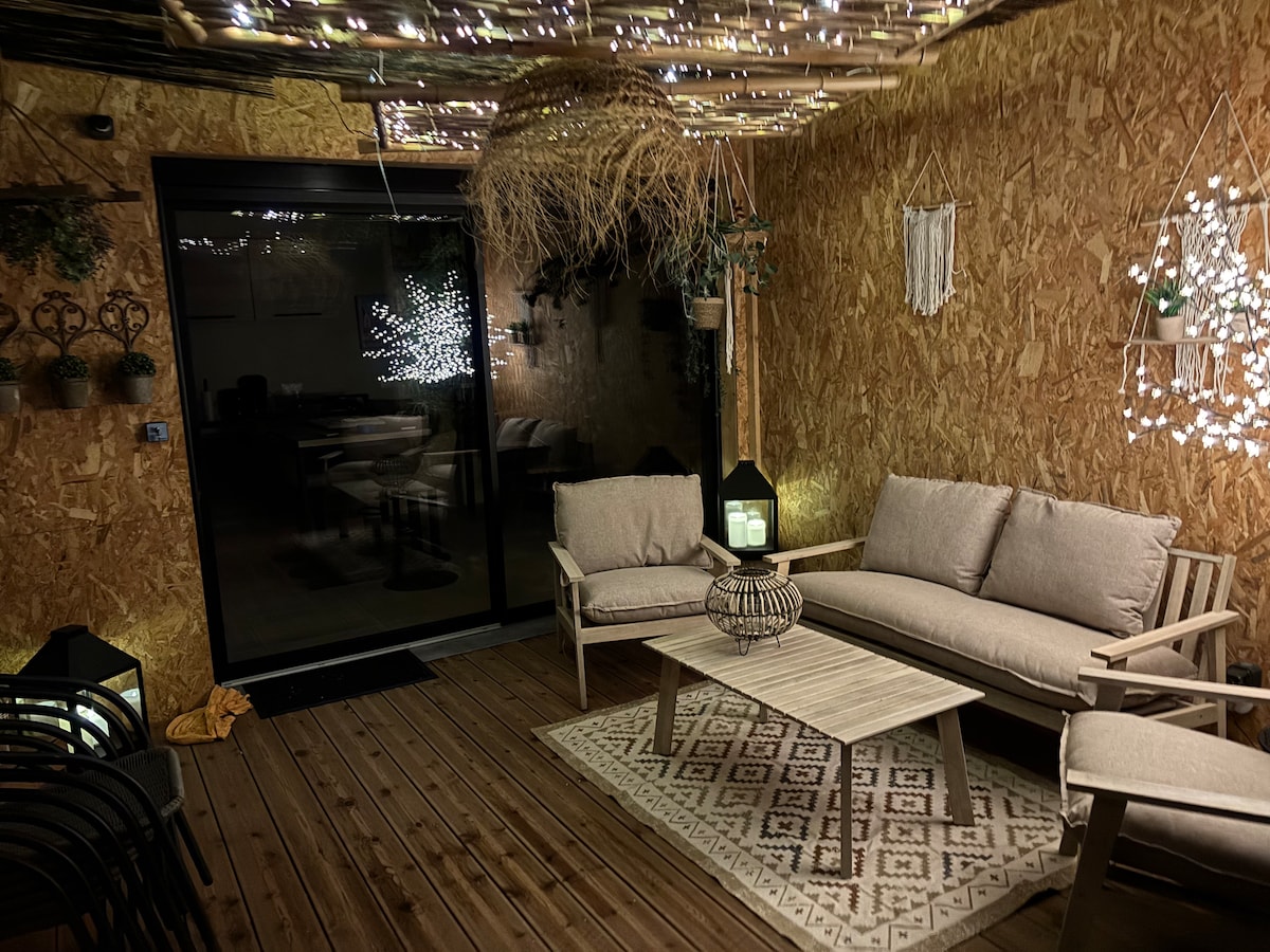 "Teras", ağaçlı bahçeye bakan güneye bakmaktadır. Şunlardan oluşmaktadır: - 90 genişliğinde ve 200 uzunluğunda 2 yataklı, kepenkli pencereli, bağlı TV ile donatılmış bir oda. - bir çekyat Bu odayı şilte üzerinde 180 cm genişliğinde bir yatak yapma imkanı. - Duş, havlu kurutucu, saç kurutucu bulunan bir banyo - fırın, mikrodalga fırın, buzdolabı bulunan bir mutfak alanı. - 4K TV - Klima Çarşaf ve havlu seçeneği bir gece için 10 €