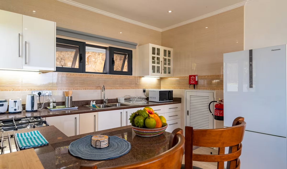 EDEN HİLLS REZİDANSI: Otantik, ada tarzı bir mutlulukla bir randevu. Eden Hills Residence, kendinizi doğayla iç içe hissettiğiniz yemyeşil tropikal bir ortamda kurulmuştur. Çıplak granit kayaları ve yabani bitki örtüsü, alçaktan uçan meyve yarasaları ve kuşların farklı sesleri ile harika dağ manzarası günlük bir şeydir. Eden Hills Residence'ta hiçbir şey yapamazsın ya da her şeyi yapamazsın. Misafirler özellikle geniş yaşam alanını ve evden eve farklı ambiyansı tercih edecektir. Eden Hills, 5 -7 dakika yürüme mesafesinde 2 sessiz sevimli plaja sahiptir. Anse Boileau Plajı size sadece suda oturup manzaranın tadını çıkarabileceğiniz oldukça alçak bir gelgit denizi sunuyor. Anse Louis plajı muhteşem bir gün batımı sunar, yüzmek ve şnorkelle yüzmek için iyidir. Bazı yerliler burada kayalıklarda balık tutmayı bile seviyor. Bu tek yatak odalı daire tam donanımlı bir mutfaktan oluşmaktadır. Fırın, indüksiyon ocağı, mikrodalga fırın, bulaşık makinesi, çamaşır makinesi, su ısıtıcısı, ekmek kızartma makinesi, blender, lavazza kahve makinesi, pirinç ocağı. Bornoz, saç kurutma makinesi, plaj havlusu ve çantası, kasa, ütü de odanızda ve tüm banyo olanaklarında mevcuttur. Dairenizde özel eğlence olarak kablolu TV, Bose Bluetooth hoparlör, oyun kartları, sınırsız WIFI, ücretsiz yerel aramalar bulunmaktadır. Resepsiyonda ödünç alabileceğiniz çeşitli kitaplar var. Eden Hills Residence günlük hizmetçilik hizmeti ve geri çevirme, kişi başına günlük 1,5 litre maden suyu, ücretsiz çay ve kahve sunmaktadır. Geldiğinizde buzdolabınızda hoş geldiniz yiyecek ve içecek başlangıç paketi ve mevsimlik meyve kasesi olacaktır. Tesise girdikten sonra size araç kiralama, gezilecek yerler, yürüyüş, tüplü dalış , şnorkelle dalış ve daha birçok aktivite konusunda yardımcı olabiliriz. Hareket etmeyi kolaylaştırmak için araç kiralamanızı öneririz. Sürüş konusunda içiniz rahat değilse 5 dakika yürüme mesafesinde otobüs durakları vardır. Otobüs ücreti kişi başına SR7 'dir, bu dünya çapında en ucuz olmalıdır. Otobüse binmek güvenli, kolay ve maceralıdır. Arabayla on beş dakika içinde yaklaşık 6 farklı restoranda veya kafede yemek yiyebileceksiniz ve 5 dakika içinde dairenize yerel akşam yemeği teslimatı yapabilecek mükemmel bir yemek şirketimiz olacak. Ya da taze yerel balık, meyve ve sebze seçeneklerinizi pişirebilirsiniz. Eden Hills Residence'ta misafirlerimize unutulmaz bir tatil yaşatmak için elimizden geleni yapıyoruz. Sizinle buluşmak ve Eden Hills Residence'a gecikmeden varmanızı sağlamak için Havalimanı'ndayız.