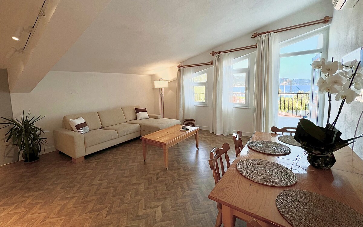 Kaş'ın merkezinde zamansız deniz manzaralı çatı katı.