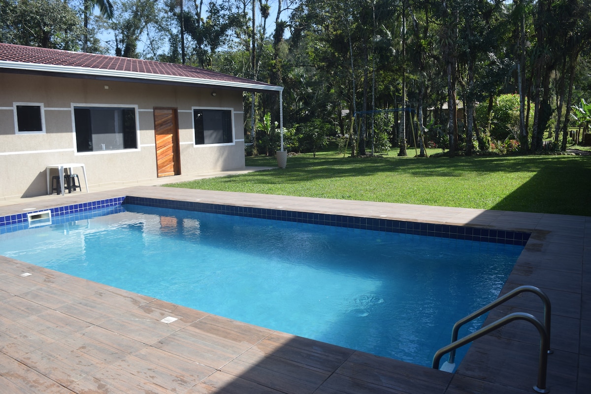 Karışık ev, ahşap ve duvarcılık, doğrudan Serra'dan gelen doğal su havuzu... barbekülü gurme alanı... odun sobası... Serra do Mar'ın güzel manzarası ile. Basit ama samimi ev, temiz, tüm odalarda vantilatör, çok sessiz yer, asfaltın kenarında kolay erişim. Artık soğuk kış günlerinde ateş yakıp tabakta çam kozalağı yemek ve ızgarada mısır kavurmak için rahat bir köşemiz de var. Ayrıca akıllı bir televizyonumuz da var.