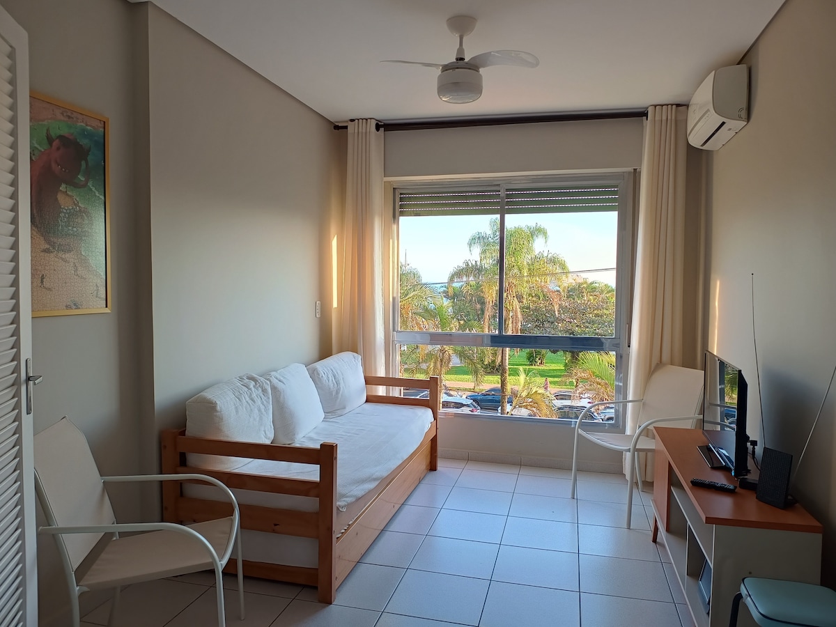 Apartamento encantador decorado de um dormitório bem espaçoso, em frente a praia com garagem