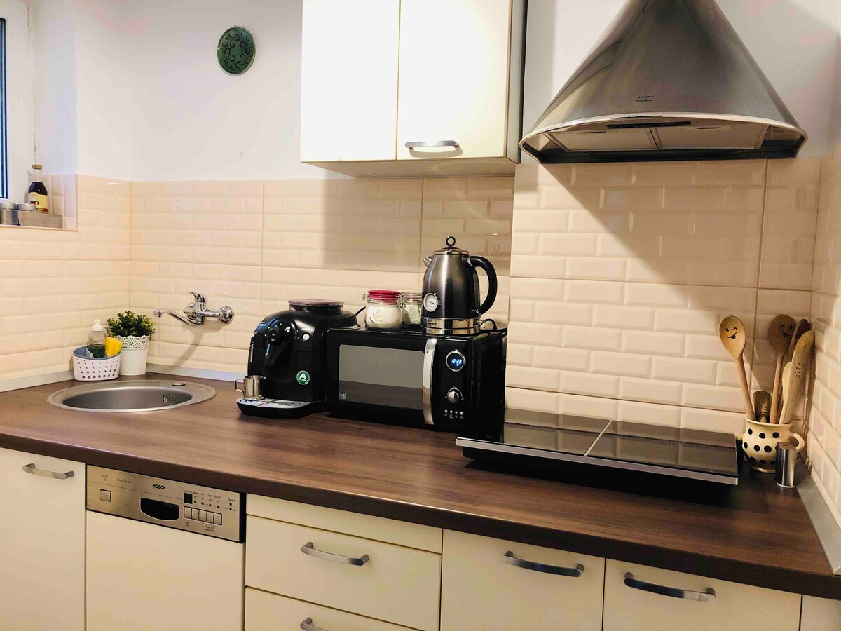 Bu sessiz ve zarif mekânda dinlenin! Daire, merdivenden ayrı girişi olan bir evin zemin katında bulunmaktadır, LG LED TV 65", tamamen mobilyalı bir mutfak, her biri çift kişilik yataklı 2 yatak odası ve 2 banyosu (biri büyük duşlu) olan geniş bir oturma odasına sahiptir. Diğer olanaklar: klima, yerden ısıtma. Evin önündeki sokakta park etmek ücretsiz ve güvenlidir. Yakınında: küçük gıda pazarı, Lidl mağazası. Şehir merkezine 1,5 km.
