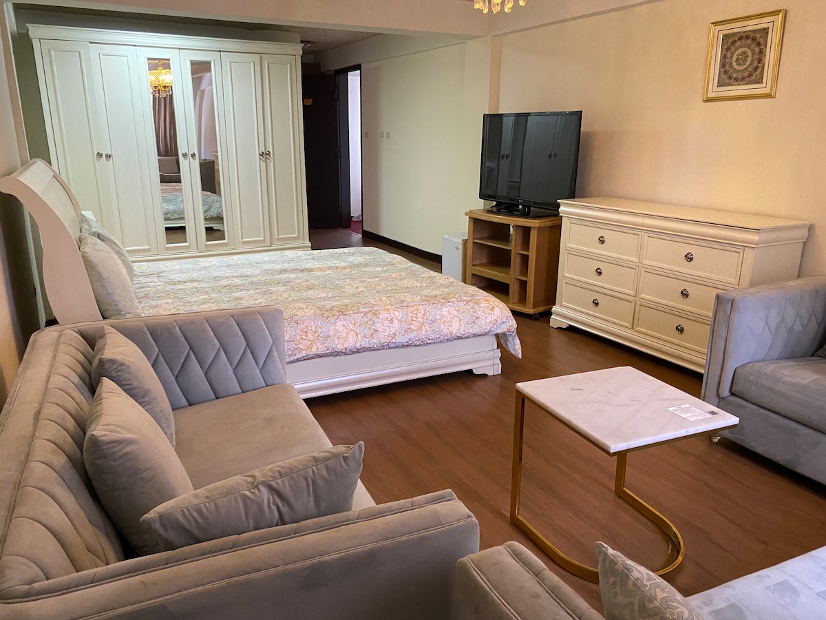 Huzurlu ve merkezi bir konumda bulunan bu yerde Addis Ababa'daki konaklamanızın keyfini çıkarın. Burası yeni, tamamen ve güzel döşenmiş bir birimdir. Apartmanda marketten eczaneye kadar ihtiyacınız olan her şey var. 3 yatak ve bir çekyat vardır. İsteğe bağlı temizlik ve hizmetçi hizmeti alabilirsiniz.