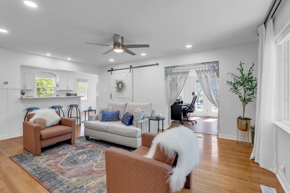 Yenilenmiş Tudor bungalov, Misafirlerin favorisi! 3 yatak odası/2 banyo, bölünmüş king süit ve herkesin yayılabileceği iki oturma odası. Tam donanımlı mutfak, tüm odalarda TV ve hızlı kablosuz internet bağlantısı. Izgara ile özel çitle çevrili arka bahçe, çocuklar ve evcil hayvanlar için harika. Park yeri bulmak kolay ve Arkansas City şehir merkezine yakın. Aileler, arkadaşlar, iş seyahatleri ve daha uzun konaklamalar için mükemmel!
