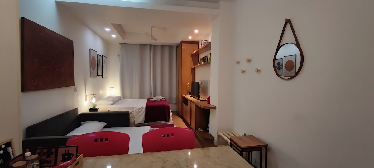 Copacabana, Arpoador ve Ipanema arasında, plaja ve metroya birkaç adım uzaklıkta modern ve konforlu stüdyo. Konfor, pratiklik ve harika bir konum arayan çiftler veya iş için seyahat edenler için ideal. Hawaii kanosu, kano, standup paddle veya bisiklet sürme gibi aktivitelerin tadını çıkarın. Yürüyüş: Fort de Copacabana'ya 4 dakika mesafededir Arpoador Plajı'na 6 dakika mesafededir. Ipanema Plajı'na 6 dakika mesafededir. Ipanema/General Osório metro istasyonuna 10 dakika mesafede. Zona Sul süpermarketine 4 dakika mesafededir