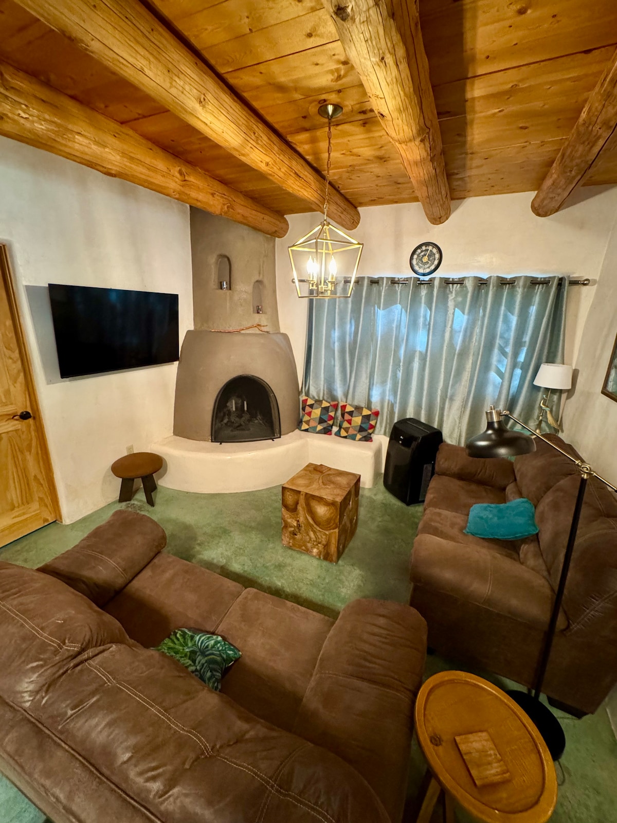 Dos Caminos Casita offers tranquil mountain views in a traditional adobe casita built over 100 years ago with updated amenities, natural light, Viga beams on the ceiling, and beautiful tile work. If you’re looking for comfort, relaxation, and beautiful views, you’ve found it here at Dos Caminos Casita. Enjoy a soak in our mineral hot tub while the Taos skies paint a canvas of rich purple, orange, blue, or pink. Perfect space to retreat to after a day of hiking, rafting, or skiing.