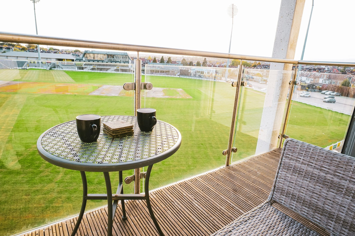 Stylish 2-bed, 2-bath apartment overlooking the cricket ground with free parking and lift access. King & double bed Private balcony + roof-terrace access Fast Wi-Fi, washer & fully equipped kitchen Step-free entry and private parking space Stroll to Gloucester Road cafés, pubs and shops in minutes, or watch the match from your balcony. Book now to secure your Bristol stay!