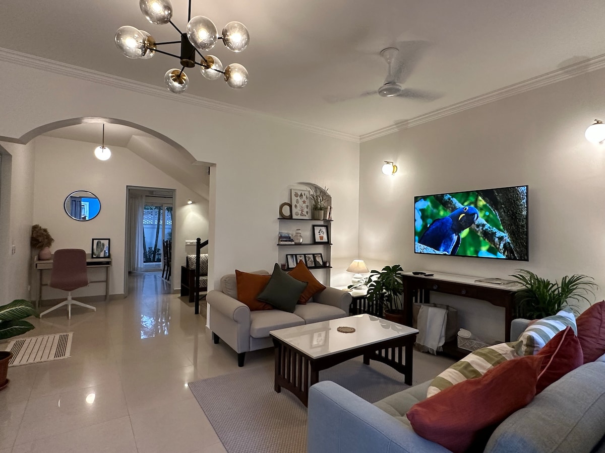 Balkonunuzda ☆ özel havuz. ☆ Kuzey Goa'daki tüm büyük plajların yanında. ☆ Calangute Plajı 6 dakika. 🛵 ☆ Candolim Plajı 13 dakika. ☆ Vagator Plajı 25 dakika. ☆ Anjuna Plajı 25 dakika. Her iki havaalanına da⇒ kolayca erişim. ⇒ Huzurlu semt. WFH için⇒ mükemmel. Masa ve fiber kablosuzu içerir. Hem arabalar hem de bisikletler için⇒ geniş park alanı. 4 yetişkin⇒ kalabilir. ⇒ Üst düzey mobilyalar, Fransız çatal bıçak takımı, 1 kral boy yatak ve 1 kraliçe boy çekyat. ⇒ 55 inç akıllı TV, PlayStation ve Marshall hoparlörler.