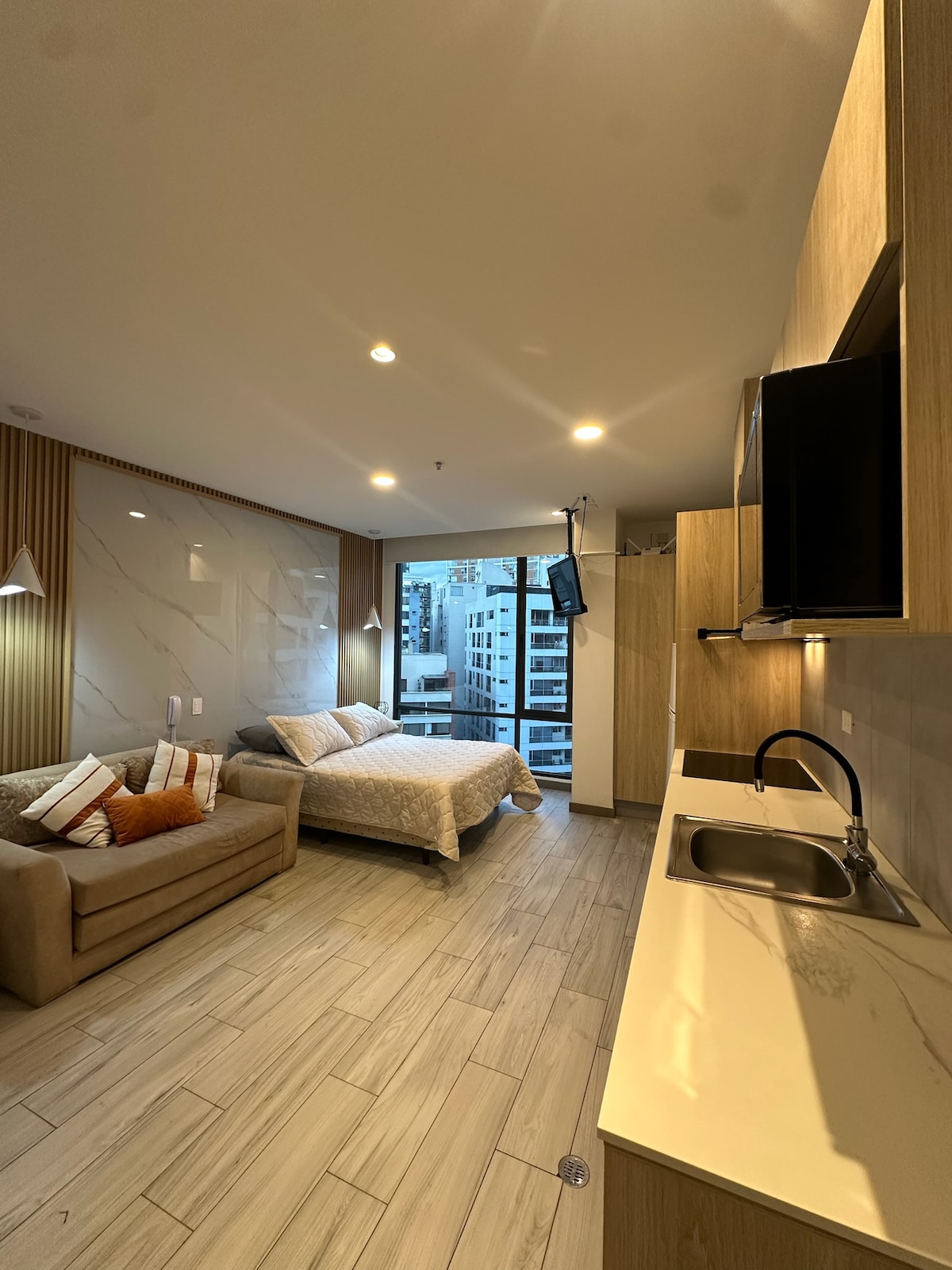 Ekvador'un Quito kentindeki bu merkezi stüdyo dairede şık bir konaklamanın tadını çıkarın. Stratejik bir konumda bulunan bu daire, mağazalara kolay erişim ve terastan La Carolina'nın 360 derecelik panoramik manzarasını sunuyor. Modern iç tasarım konfor ve misafirperverlik sağlar. Yüzme havuzları, jakuzi, sauna ve Türk hamamı bulunan ortak alanlarımız bulunmaktadır. Misafirler ortak çalışma ve dinlenme alanlarını kullanabilir. Çekyat, spor salonu, ücretsiz WiFi, ücretsiz otopark ve 24 saat güvenliğimiz bulunmaktadır. :)