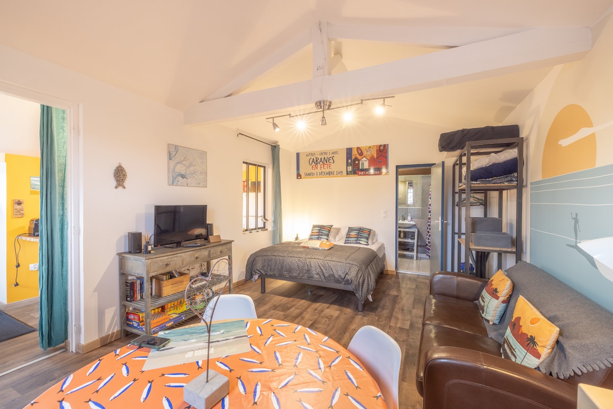 Notre petit nouveau « Le loft « accueille 2 personnes (+1 bébé peut être possible)#Arrivée en autonomie (boîte à clés avec code ) Coin cuisine /salle de bain /chambre idéale pour un pied à terre à proximité de la vie Andernosienne Vous bénéficiez d’un jardin privatif avec barbecue Ce logement est mitoyen avec La Cabane à Sandy idéal pour deux couples mais ils sont indépendants Parking voiture Découvrez notre décoration loft version bassin d’Arcachon N. Enregistrement3300500023943