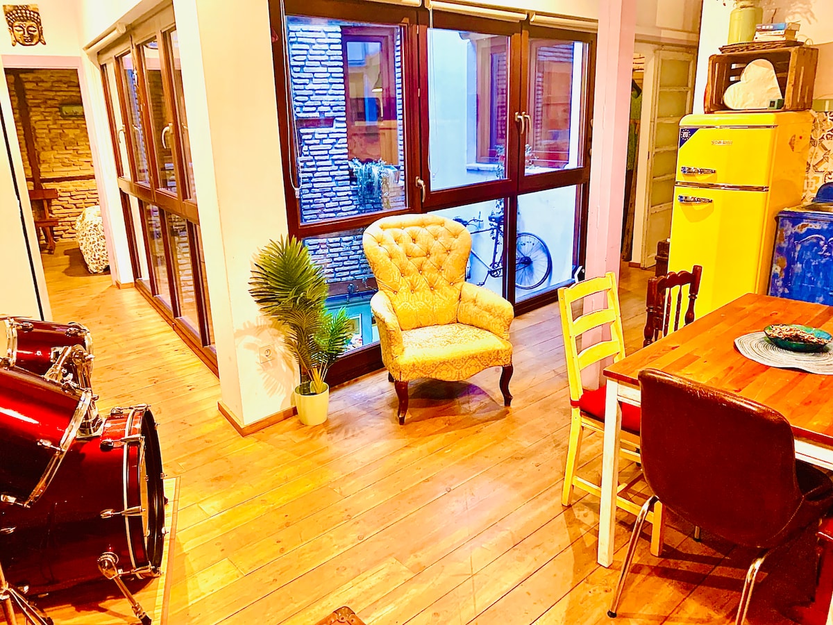 Benzersiz bir eve sahip olmanın unsurlarından biri, uluslararası iç tasarımda model bir Easter Ortega kanepesi kullanmaktı. Odalar eski atölyelerden eski cam pencerelerle ayrılmıştır. Bitkilerle birlikte her şey sizi bir seraya taşıyacak benzersiz bir atmosfer yaratır. Madrid Müzik Konservatuarı'ndan gelen koltuklarla birlikte eski kahve sandalyeleri oturma odasına benzersiz bir dokunuş kazandırıyor. Caldereria Nueva'ya paralel bir sokakta yer alır