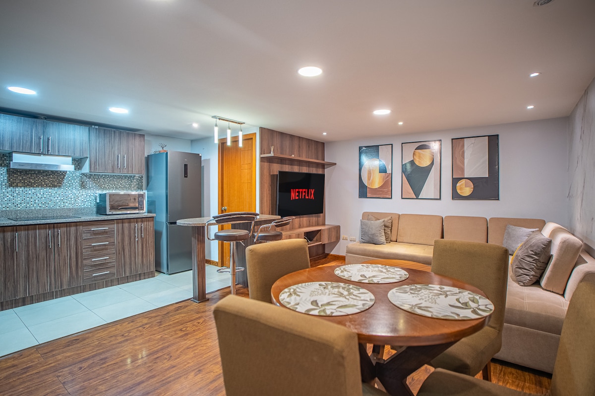 Este elegante alojamiento es ideal para noches de pareja, familia corta o estadías largas de trabajo. Contamos con jacuzzi dentro del departamento, chimenea de bioetanol y una sala con una pantalla de 85” para las mejores noches y experiencias inolvidables de sus vacaciones. Cama tamaño king y hermosos balcones. Cocina propia con todos los implementos necesarios. Cerca de lavanderías, tiendas, restaurantes. Parqueadero propio y cámaras con vista a la calle para su tranquilidad.