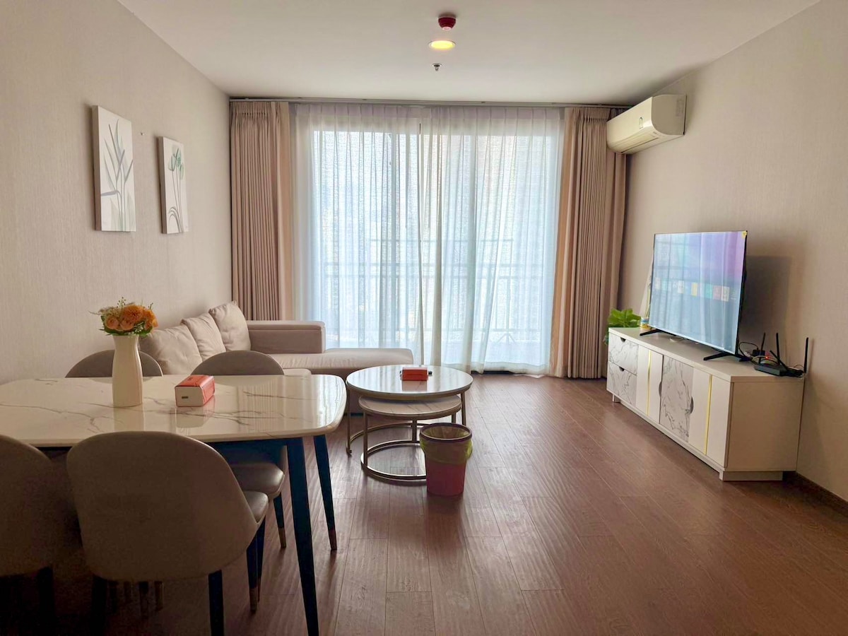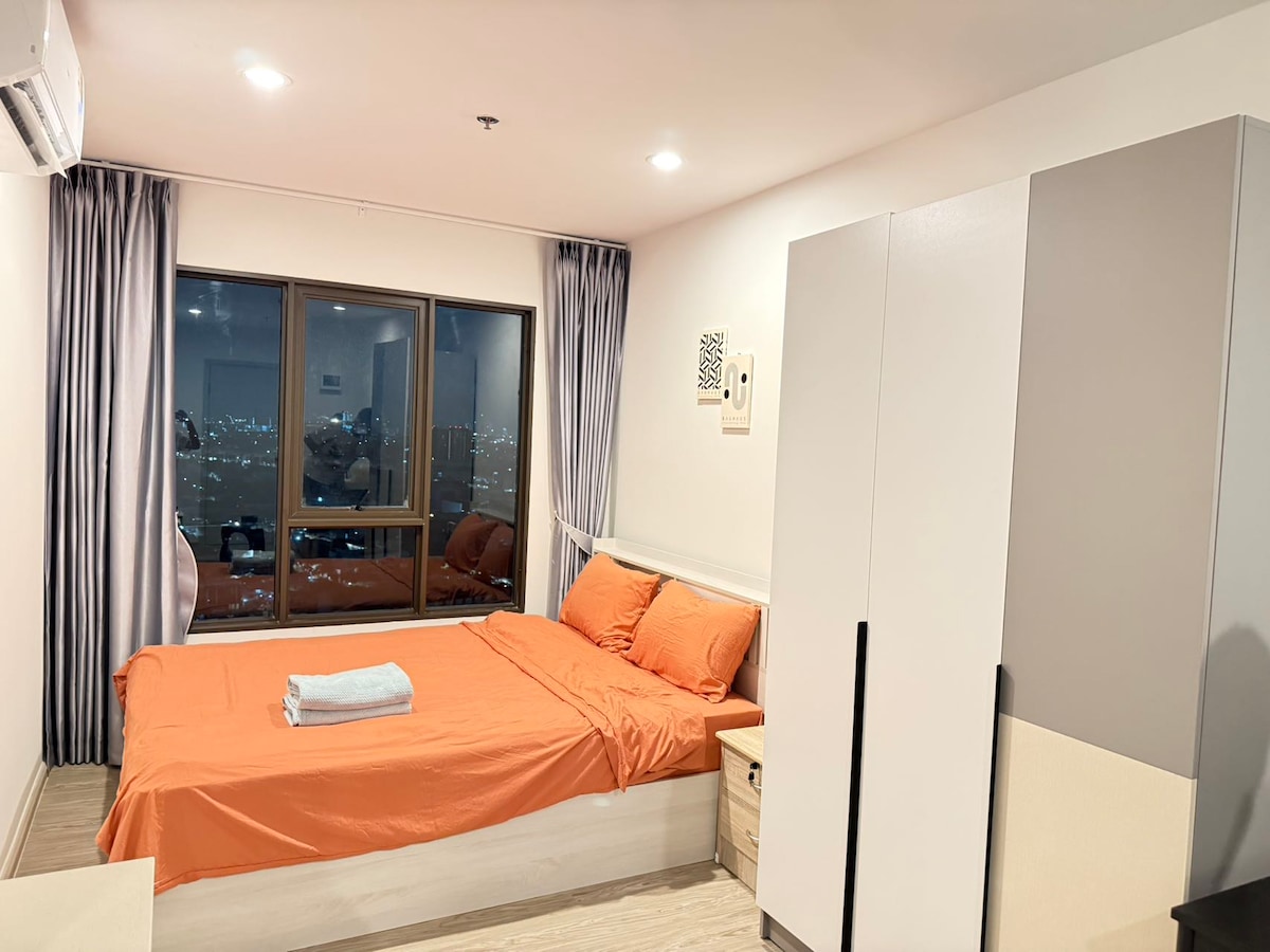 Chic City Hideaway Steps from BTS Phra Khanong Enjoy modern comfort in this bright one-bedroom condo just a short walk from BTS Phra Khanong — perfectly positioned for exploring Sukhumvit or working from the city. • Light-filled living space with floor-to-ceiling windows • Plush queen bed with blackout curtains for deep, restful sleep • Lightning-fast Wi-Fi and a 55″ smart TV (Netflix-ready) — ideal for work or winding down