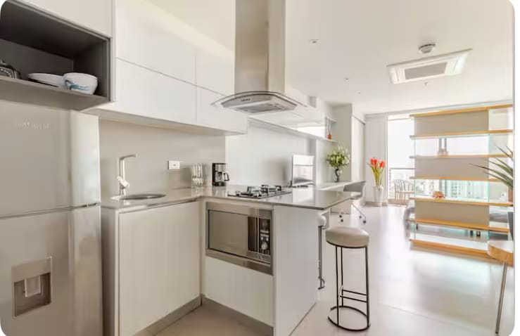 Her biri özel banyoya, ekstra konforlu yataklara, akıllı TV'lere ve iki çalışma alanına sahip iki yatak odalı bu modern dairede dinlenin ve rahatlayın. Barranquilla'nın merkezinde, restoranlara, alışveriş merkezlerine ve ulaşım araçlarına sadece 5 dakika mesafede. Otel tipi lobi, 7/24 güvenlik, otopark ve asansörlerle Distrito 90'da konaklayın. Mükemmel konfor ve konum. Şimdi rezervasyon yapın!