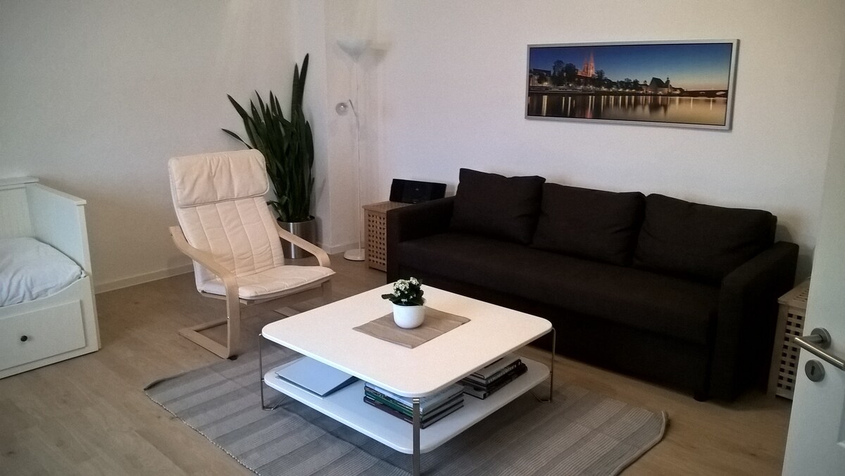 Zemin katta 38 m2 daire, stüdyo, koruma altındaki tarihi bina, şık mobilyalar, villa bölgesi, WLAN/CAT 7 Havaalanına, şehirlerarası trenlere, banliyö trenlerine, otobüslere ideal bağlantı, Marienplatz'a 15 dakika Alışveriş merkezi, restoranlar, bira bahçesi yürüme mesafesinde. Özel girişi yoktur. Ev sahipleri / kiraya verenler aynı evde yaşıyor.