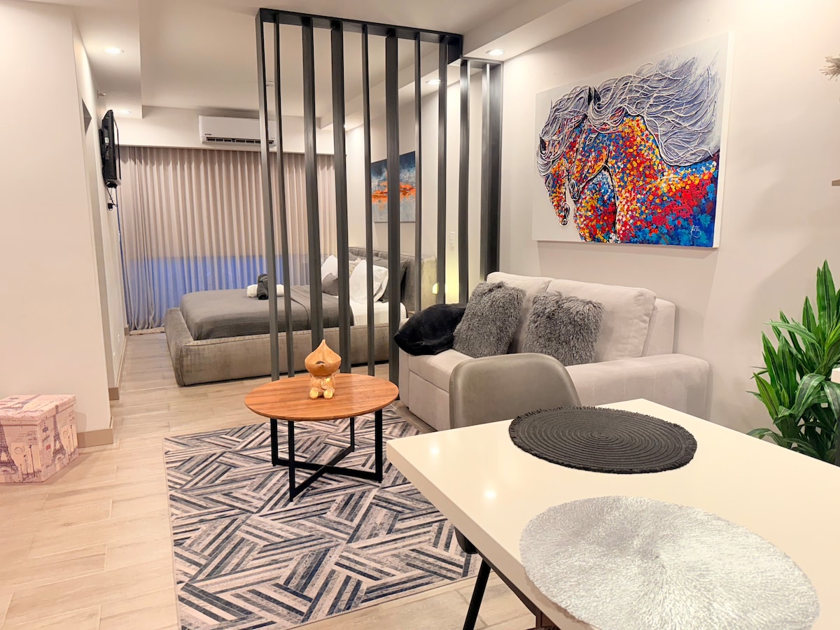 Disfruta de una experiencia con estilo en este alojamiento céntrico. Este apartamento estudio está diseñado con un toque moderno elegante y sofisticado que garantiza una experiencia única, además cuenta con un estacionamiento gratuito p-215, puede disfrutar de una plaza con tiendas , farmacias supermercados y restaurantes, además hay un boliche cerca del apartamento. El edificio cuenta con sala de reuniones, cine privado, gimnasio, terraza con vista a la piscina y seguridad las 24h.