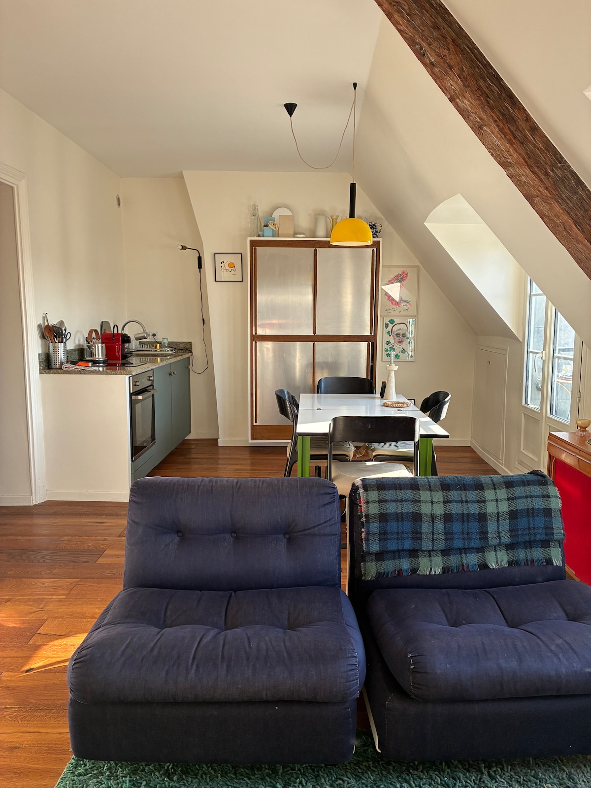 Paris'in en havalı iki semti olan Belleville ve Jourdain arasında manzaralı çatı katı! Metro evin hemen dibinde (République 10 dakika, Châtelet 15 dakika). République'ye 15 dakika yürüyerek de ulaşılabilirsiniz. Daire dinlendirici, aydınlık ve rahattır. Orada yaşadığım için çok şanslıyım ve bu yeri paylaşmaktan mutluluk duyarım.