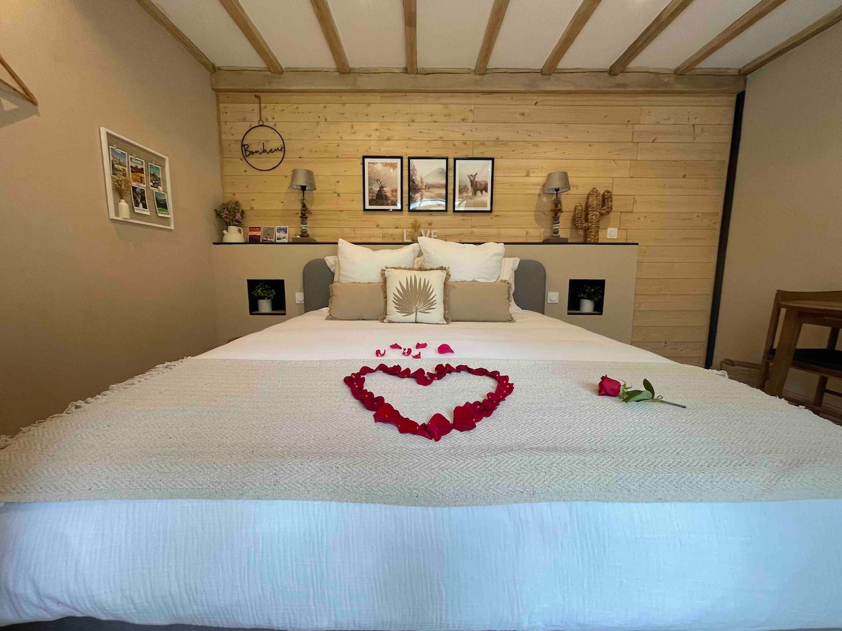 Benzersiz bir dekora sahip, cazibe dolu, kozalaklı bir dünyaya sahip Love Room. Talep üzerine isteğe bağlı 2 kişilik Balneo küvet ile donatılmıştır (akşam başına 50 €), iki kişilik bir an için idealdir. Yuvarlak king boy yatağı, mutfağı, verandası ve alışılmadık ve sıcak dekorasyonu ile bu samimi küçük yuvayı takdir edeceksiniz. Nay'ın göbeğinde, sessiz bir alt bölümde, tamamen bizim tarafımızdan yaratılan ve tasarlanan bu huzurlu yere gelin ve kaçın.