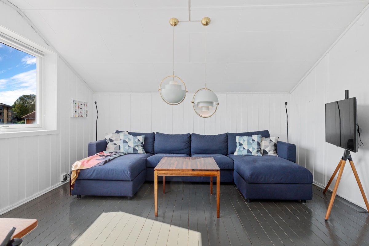 Çatı katında oturma odası ve çalışma alanı olan geniş daire