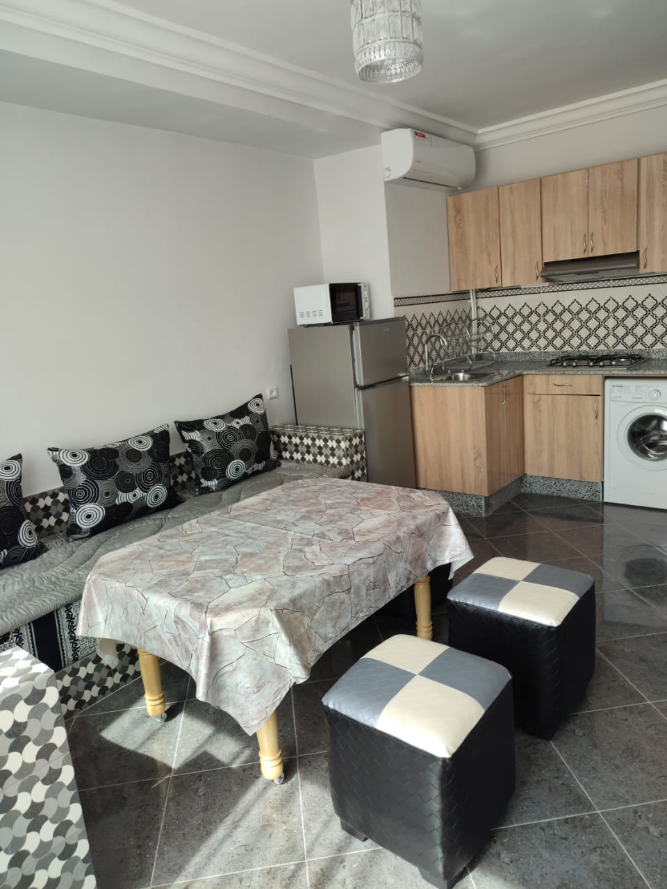 Découvrez un havre de paix au cœur de la ville où le confort moderne rencontre le charme historique. Depuis notre balcon privé, profitez d'une vue imprenable sur les toits de la ville berbère d'Ahfir, située à la frontière Algérienne dans la région de l'Oriental. A seulement 15 minutes de la magnifique plage de Saidia. Bénéficiez d'appartements neufs de 5 et 7 personnes entièrement équipés. L'ascenseur vous permettra d'accéder directement à notre salle de sport privée.