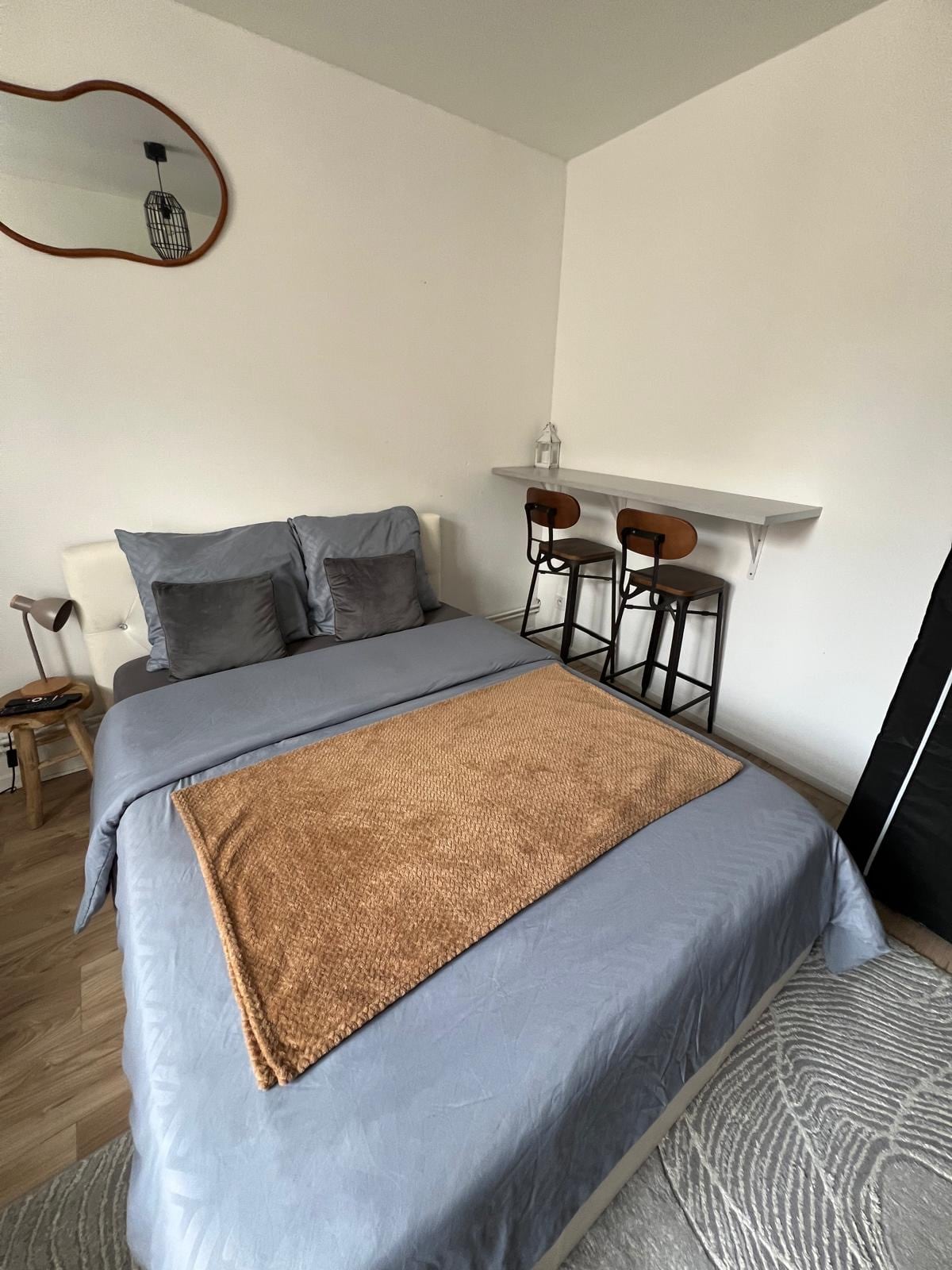 Ds bourg à 10' du centre-ville de Reims, vous traverserez un chartil pour entrer ds ce 2 pièces de 40m2 indépendant mais attenant à notre maison. . 1 Pièce principale avec cuisine (frigo, plaques, mini-four, cafetière) et 1 canapé-lit. . 1 chambre avec 1 lit double, 1 lit simple, 1 bureau . 1 Salle de bain avec douche et WC. Au calme, petite terrasse bois, vue sur jardin. Lits faits. Serviettes fournies N'hésitez pas à nous contacter si vous avez des demandes spécifiques : heure d'arrivée, ..