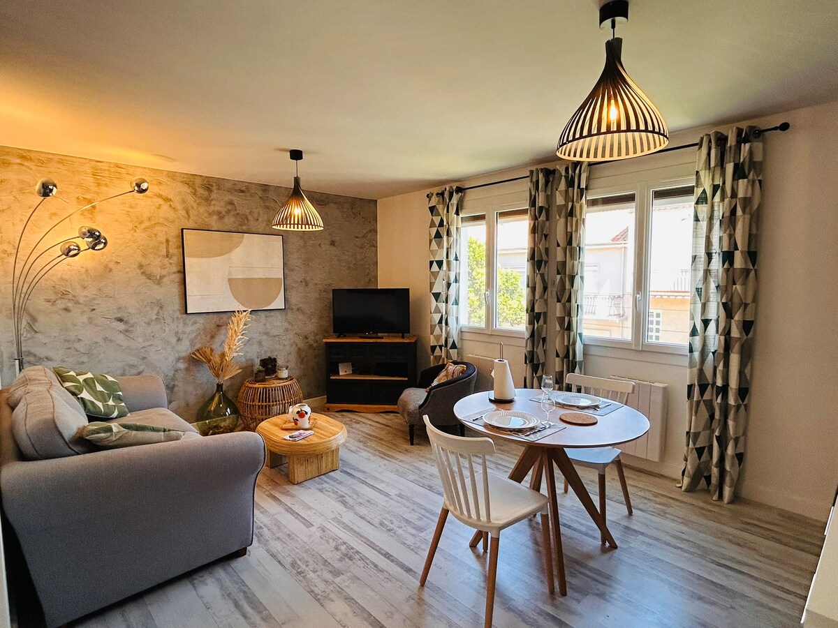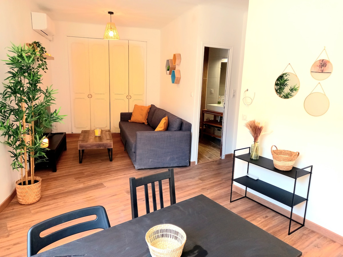 Profitez d'un logement élégant et central face aux Halles de Béziers, élues "plus beau marché de France 2025". Cet appartement de deux pièces climatisé et décoré par une architecte d'intérieur se trouve au troisième étage. La chambre est au calme et le séjour dispose d' un canapé convertible et de WC séparés. De plus, rénové en 2025, cet appartement est écologique et classé A+. Ce logement n’est pas adapté aux personnes à mobilité réduite. Logement pas adapté PMR
