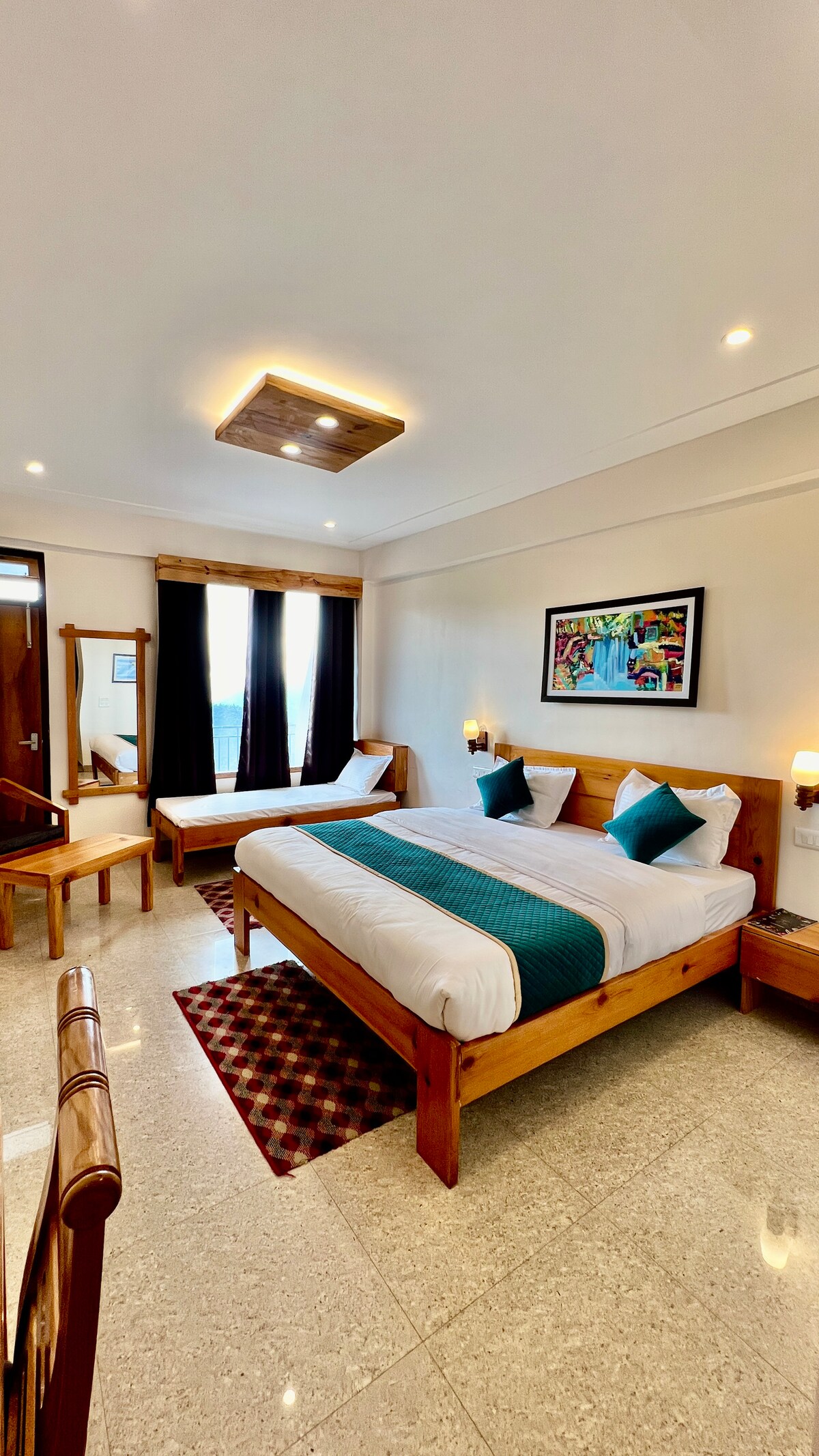 Lüks Çatı Katı Süiti, samimiyet ve zarafet arayan gezginler için tasarlanmış havadar, ışık dolu bir sığınaktır. Eğimli ahşap tavanları, katmanlı dokuları ve vadiye bakan özel balkonu ile uzun sabahları, yavaş akşamları ve sessiz düşünceyi davet ediyor. Özenle seçilmiş dekorasyonlardan yumuşak dağ ışığına kadar her ayrıntı, huzur dolu bir koza oluşturuyor. Çiftler veya yalnız seyahat edenler için ideal olan bu süit, zarif konforu Ramgarh'ın yamaçlarındaki dinginliğin zamansız cazibesiyle harmanlıyor.