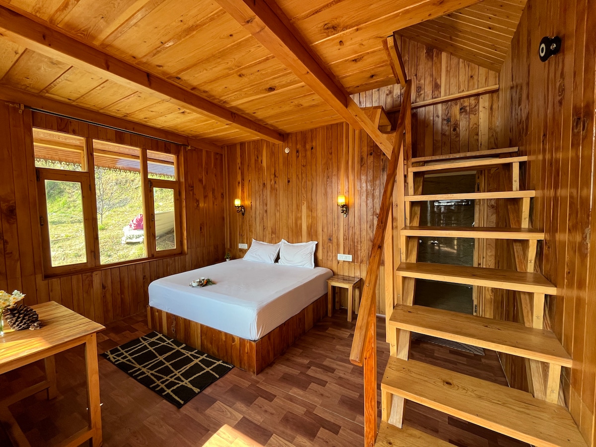 * Bu huzurlu konaklama yerinde ailece dinlenebilirsiniz. Dağın ortasında muhteşem manzaralı ahşap bir kır evi. * Geniş bir yatak odası ve yatak odası olarak işlev gören bir çatı katı var. * Ateş yakma 500/- * Ücretsiz geniş bant kablosuz internet bağlantısı. * Kulübemiz kasabanın en güzel yerlerinden birinde. * Bizimle konaklayan her misafir mutlu ayrıldı. * 700 metrelik bir yürüyüş var, genç yetişkinlerin %99'u bunu yapabilir.