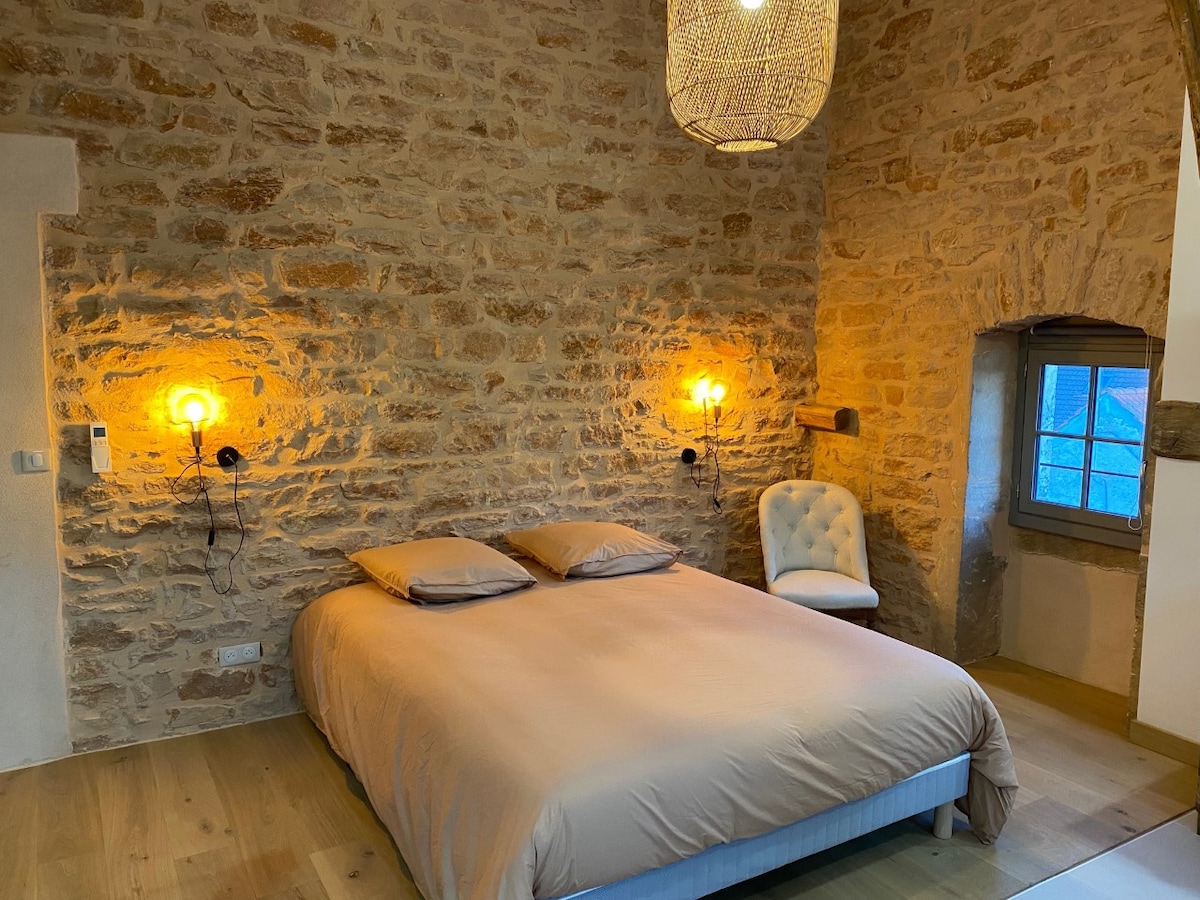 Venez profiter d'un instant de quiétude dans cette ancienne ferme vigneronne et agricole entièrement rénovée au cœur du Mâconnais situé à 5 mn de la sortie du péage A6 Mâcon Nord. Vous bénéficierez d’une superficie de 40m2 tout confort. Climatisation, cuisine toute équipée, chambre avec lit 140 électrique à mémoire de forme, salle d'eau avec sa douche italienne, TV , terrasse privative, parking sécurisé et fermé, canapé convertible 2 places...