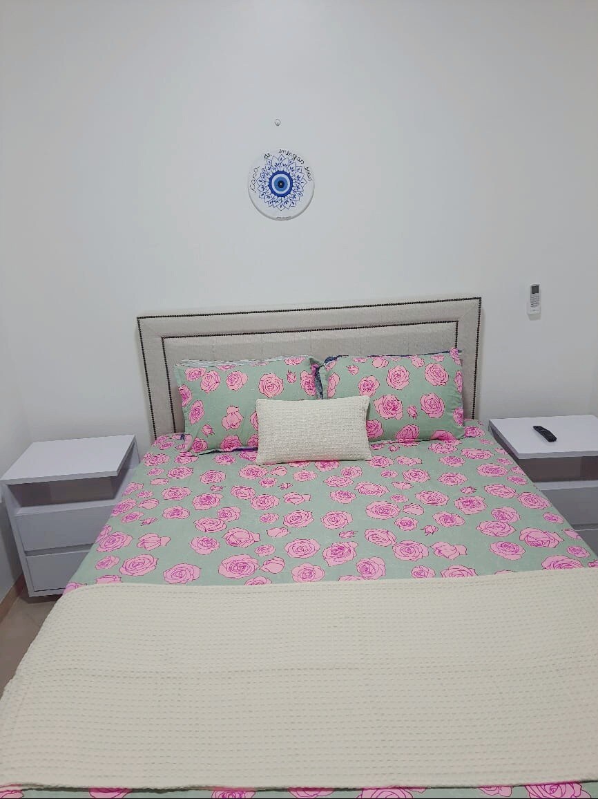 Bu sakin konaklama yerinde tüm ailenizle dinlenin. Klimalı, ÇİFT kişilik yataklı 1 yatak odalı daire. Elektrikli duşlu banyo. TV ve 1 çekyat ve vantilatör bulunan oda. İki gözlü ocaklı ve mutfak gereçleri olan mutfak. Çamaşır makinesi ve ütü bulunan çamaşırhane Daireye erişmek için merdiven çıkmak gerekir